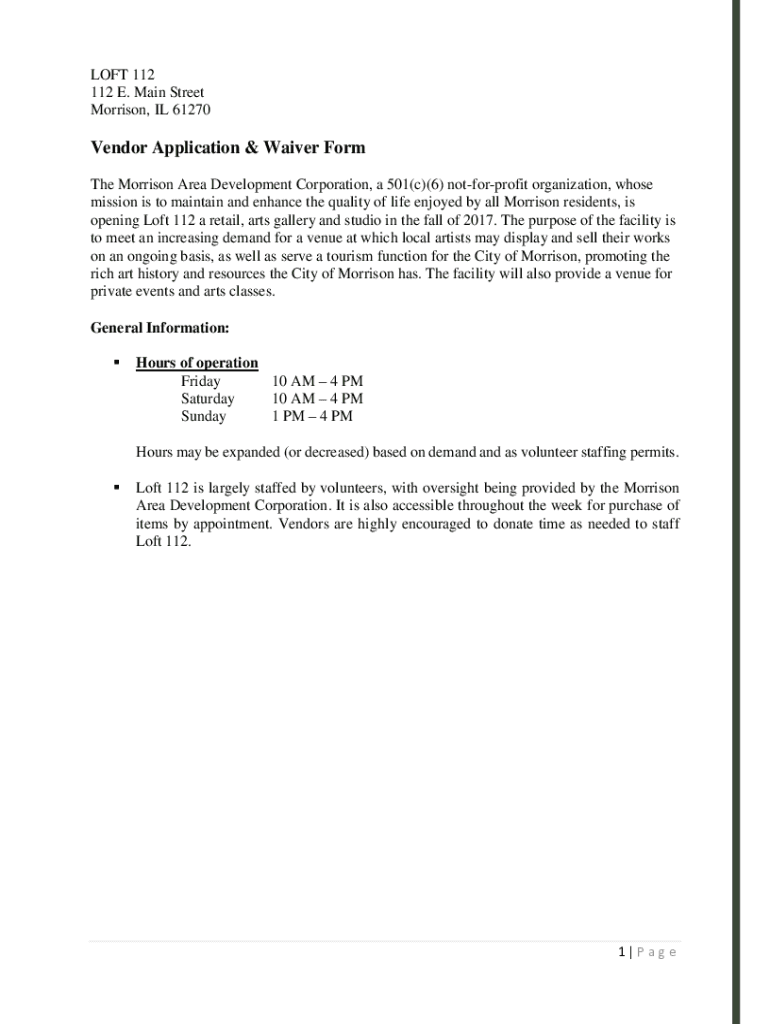 LOFT 112 112 E. Main Street Morrison, IL 61270Vendor Application & Waiver Form The Morrison Area Development Corporation, a 501(c)(6) notforprofit organization, whose mission is to maintain and enhance