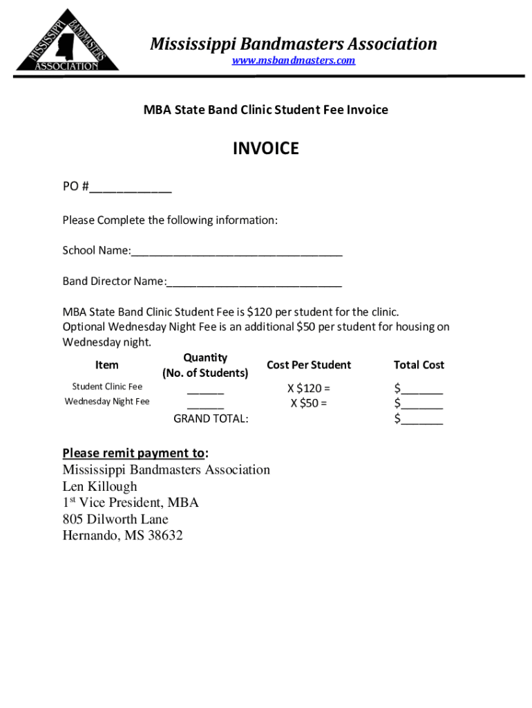 Mississippi Bandmasters Association www.msbandmasters.comMBA State Band Clinic Student Fee InvoiceINVOICE PO # Please Complete the following information: School Name: Band Director Name: MBA State