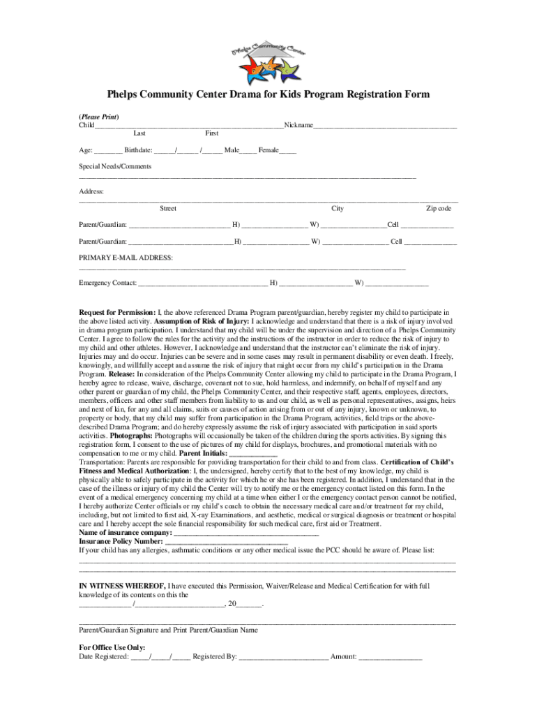 Phelps Community Center Drama for Kids Program Registration Form (Please Print) Child Nickname Last First Age: Birthdate: / / Male Female Special Needs/Comments Address: Street City Zip code Parent/Guardian: