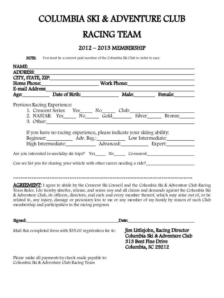 COLUMBIA SKI & ADVENTURE CLUB RACING TEAM 2012 2013 MEMBERSHIP NOTE:You must be a current paid member of the Columbia Ski Club in order to race.NAME: ADDRESS: CITY, STATE, ZIP: Home Phone: Email Address: