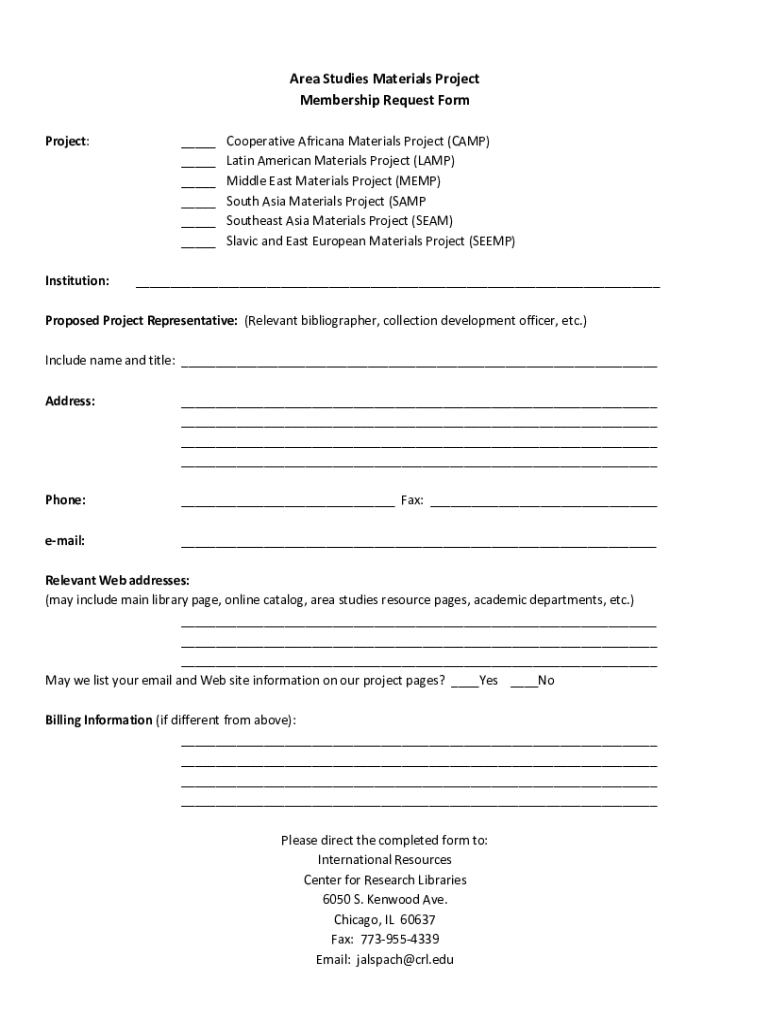 Area Studies Materials Project Membership Request Form Project:Institution: Cooperative African Materials Project (CAMP) Latin American Materials Project (LAMP) Middle East Materials Project (MEMO)