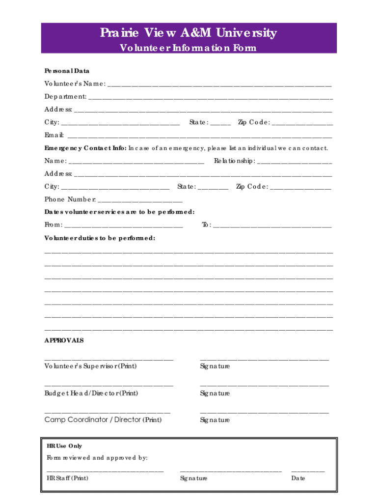 Prairie View A&M University Volunteer Information Impersonal Data Volunteers Name: Department: Address: City: State: Zip Code: Email: Emergency Contact Info: In case of an emergency, please list an