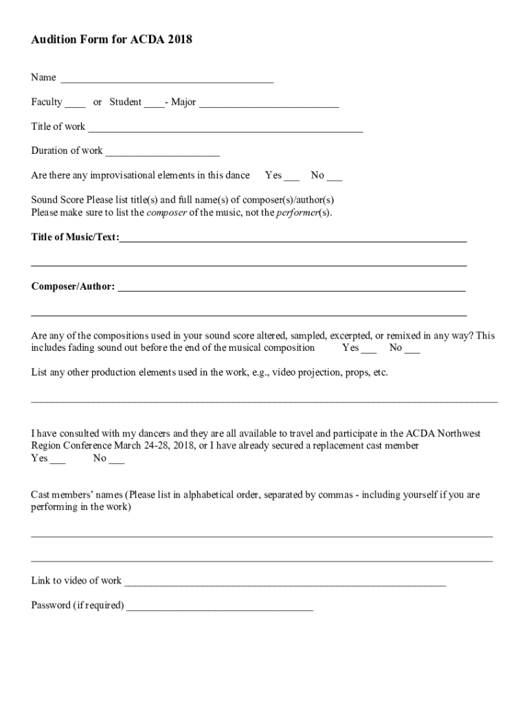 Get the free Audition Form for ACDA 2018.docx - dance utah