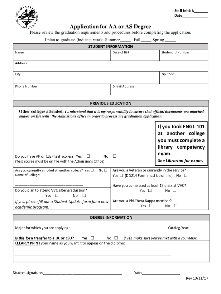 Staff Initials Date Application for AA or AS Degree Please review the graduation requirements and procedures before completing the application. I plan to graduate (indicate year): Summer Fall Spring