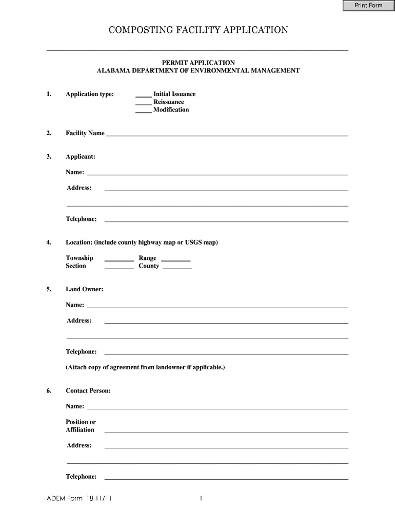 Print Form COMPOSTING FACILITY APPLICATION PERMIT APPLICATION ALABAMA DEPARTMENT OF ENVIRONMENTAL MANAGEMENT 1. Application type: 2. Facility Name 3. Initial Issuance Re issuance Modification Applicant: