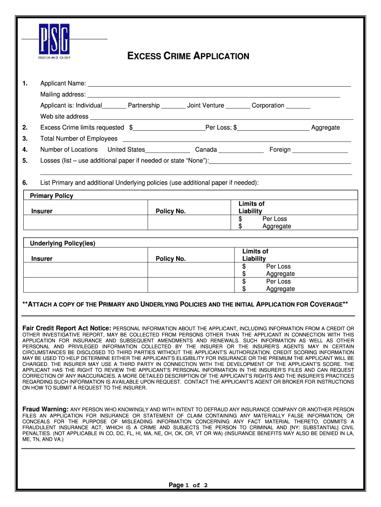The primary users of this application include businesses and organizations that may face elevated risks of crime, requiring comprehensive coverage to mitigate potential losses. Applicants will need to supply their business information and outline their desired insurance limits when completing the form.