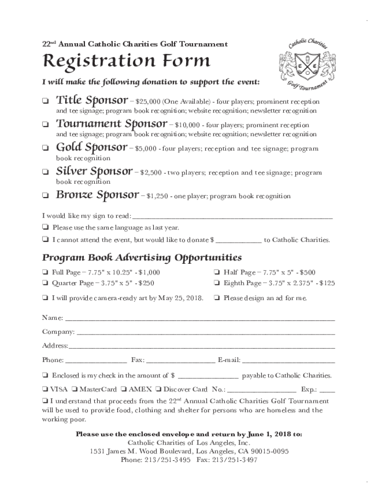 22nd Annual Catholic Charities Golf TournamentRegistration Form will make the following donation to support the event: Title Sponsor $25,000 (One Available) four players; prominent reception and tee