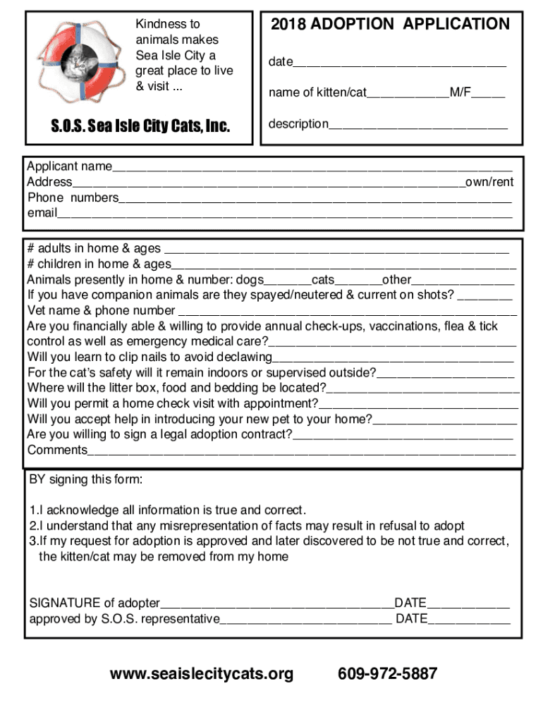 2018 ADOPTION APPLICATIONKindness to animals makes Sea Isle City a great place to live & visit ...date S.O.S. Sea Isle City Cats, Inc. Description name of kitten/cat M/F Applicant name Address own/rent