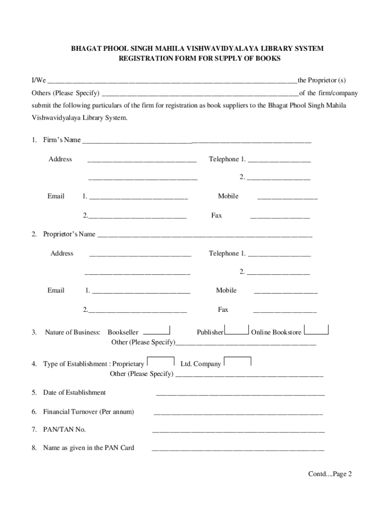 Get the free BHAGAT PHOOL SINGH MAHILA VISHWAVIDYALAYA LIBRARY SYSTEM REGISTRATION FORM FOR SUPPL...