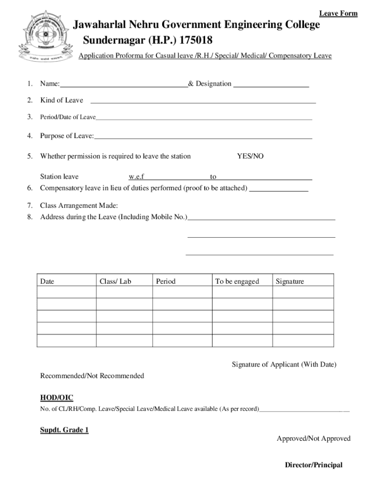 Leave FormJawaharlal Nehru Government Engineering College Sundernagar (H.P.) 175018 Application Proforma for Casual leave /R.H./ Special/ Medical/ Compensatory Leave1. Name:& Designation2. Kind of