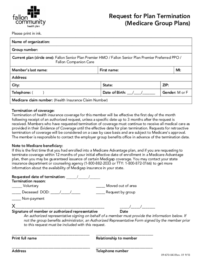 Re request for PLA a Term me nation n (Medicare e Group p Plans)) NK. Please print in me of organization: Nam Group up number: Current plan (circle one): Fallon F Senior Plan Premier HMO / F Fallon