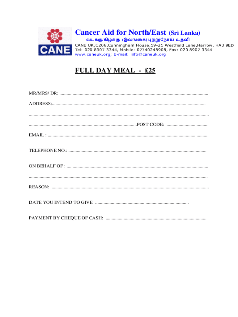 Cancer Aid for North/East (Sri Lanka) / () CANE UK,C206,Cunningham House,1921 Westfield Lane, Harrow, HA3 9ED Tel: 020 8907 3344, Mobile: 07740248908, Fax: 020 8907 3344 www.caneuk.org; Email: info