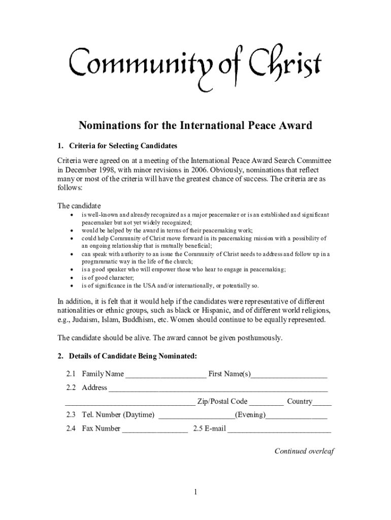 Get the free Nominations for the International Peace Award - Community of ...
