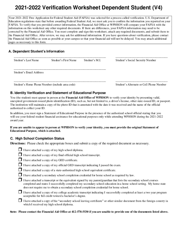 Get the free 2021-2022 Verification Worksheet Dependent Student (V4)