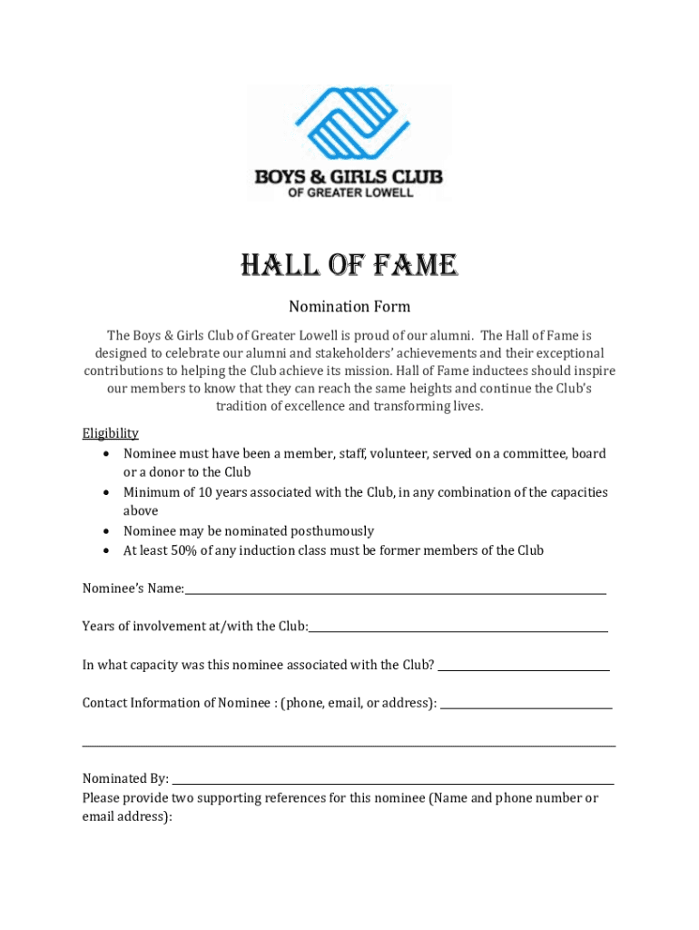 Hall Of Fame Nomination Form The Boys & Girls Club of Greater Lowell is proud of our alumni. The Hall of Fame is designed to celebrate our alumni and stakeholders achievements and their exceptional