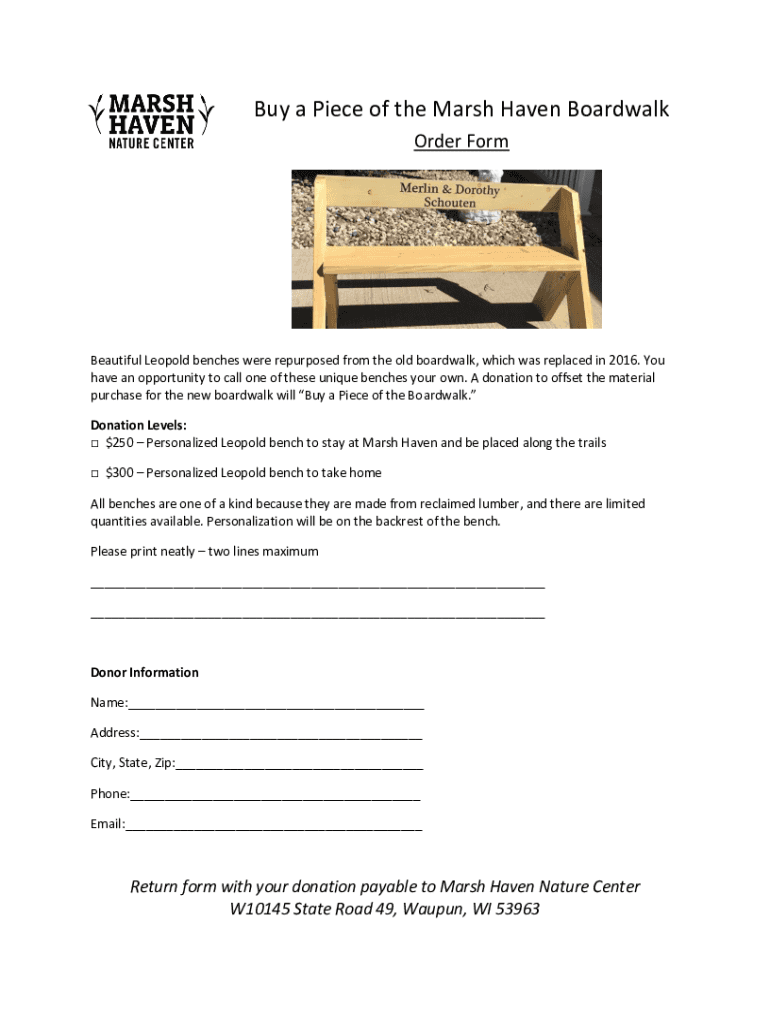 Buy a Piece of the Marsh Haven Boardwalk Order FormBeautiful Leopold benches were repurposed from the old boardwalk, which was replaced in 2016. You have an opportunity to call one of these unique