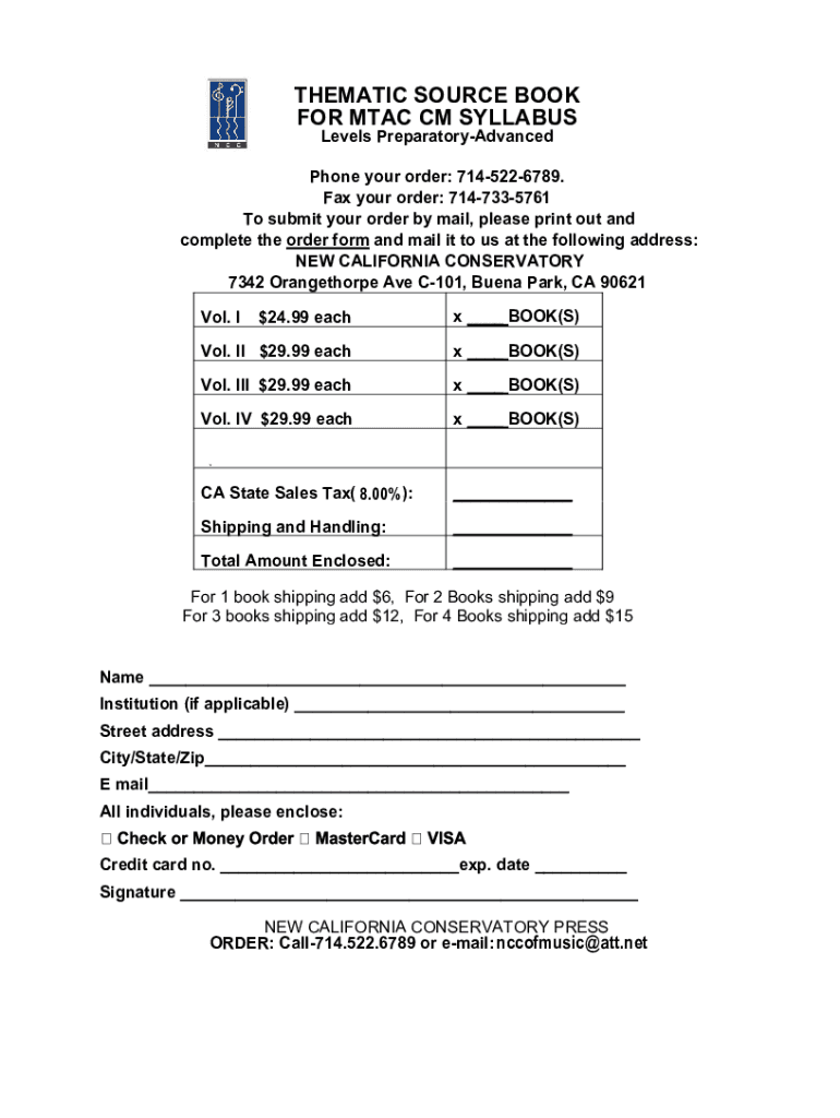 THEMATIC SOURCE BOOK FORM TAC CM SYLLABUS Levels PreparatoryAdvancedPhone your order: 7145226789. Fax your order: 7147335761 To submit your order by mail, please print out and complete the order form