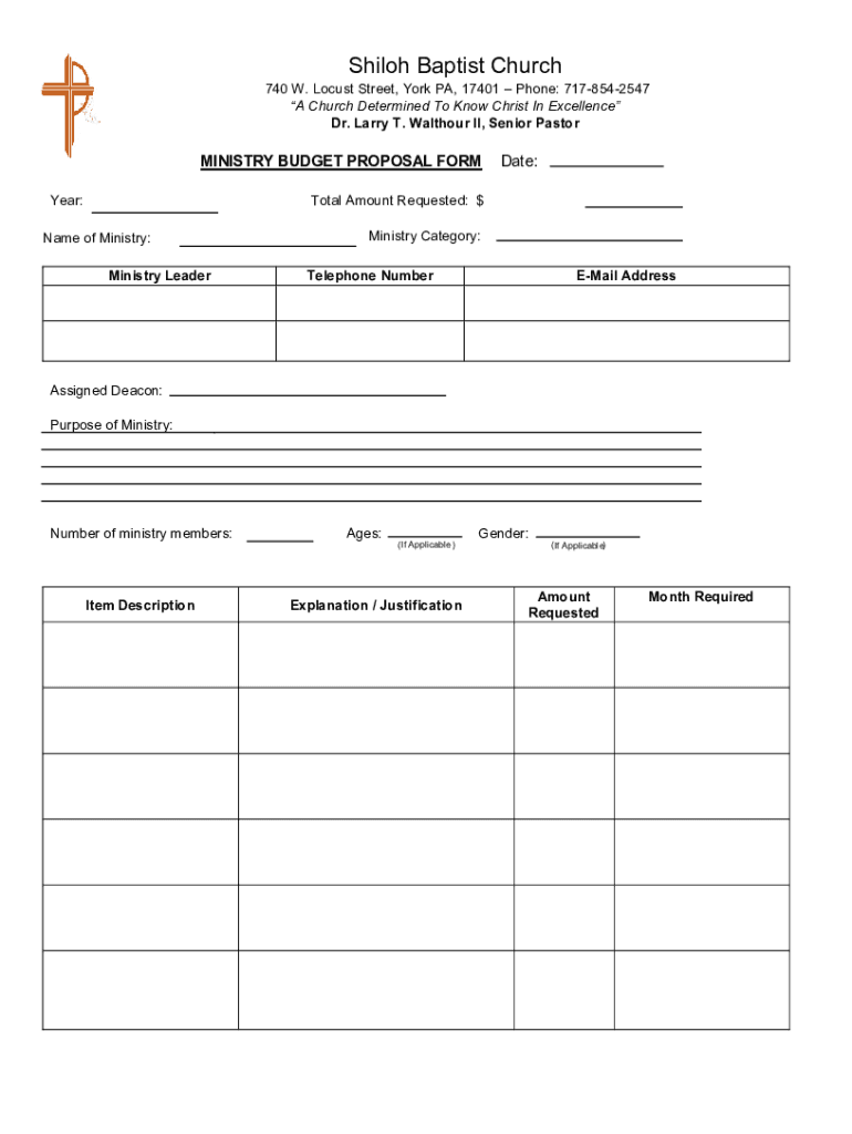 Shiloh Baptist Church740 W. Locust Street, York PA, 17401 Phones: 7178542547 A Church Determined To Know Christ In Excellence Dr. Larry T. Walt hour II, Senior PastorMINISTRY BUDGET PROPOSAL FORM