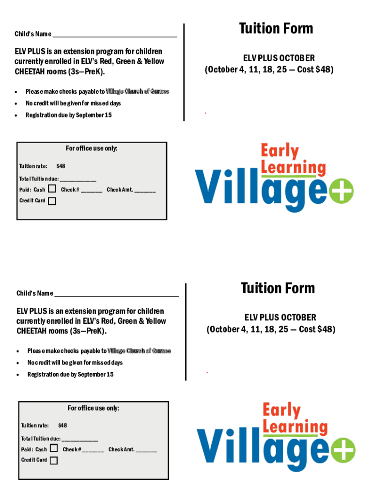Tuition Orchids Name ELF PLUS is an extension program for children currently enrolled in Elvis Red, Green & Yellow CHEETAH rooms (3sPreK). Please make checks payable to Village Church of Green credit