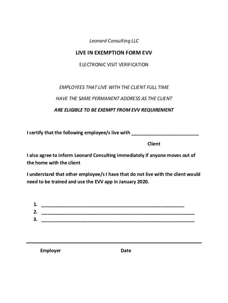 Leonard Consulting CLIVE IN EXEMPTION FORM EVE ELECTRONIC VISIT VERIFICATIONEMPLOYEES THAT LIVE WITH THE CLIENT FULL TIME HAVE THE SAME PERMANENT ADDRESS AS THE CLIENT ARE ELIGIBLE TO BE EXEMPT FROM