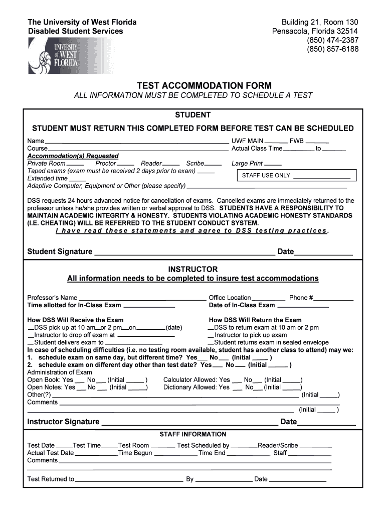The Test Accommodation Form is a document used by students and instructors to request and approve accommodations for exams at the University of West Florida.