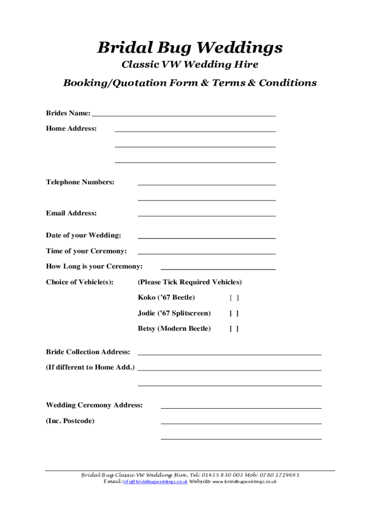 Bridal Bug Weddings Classic VW Wedding Hire Booking/Quotation Form & Terms & Conditions Brides Name: Home Address:Telephone Numbers:Email Address: Date of your Wedding: Time of your Ceremony: How