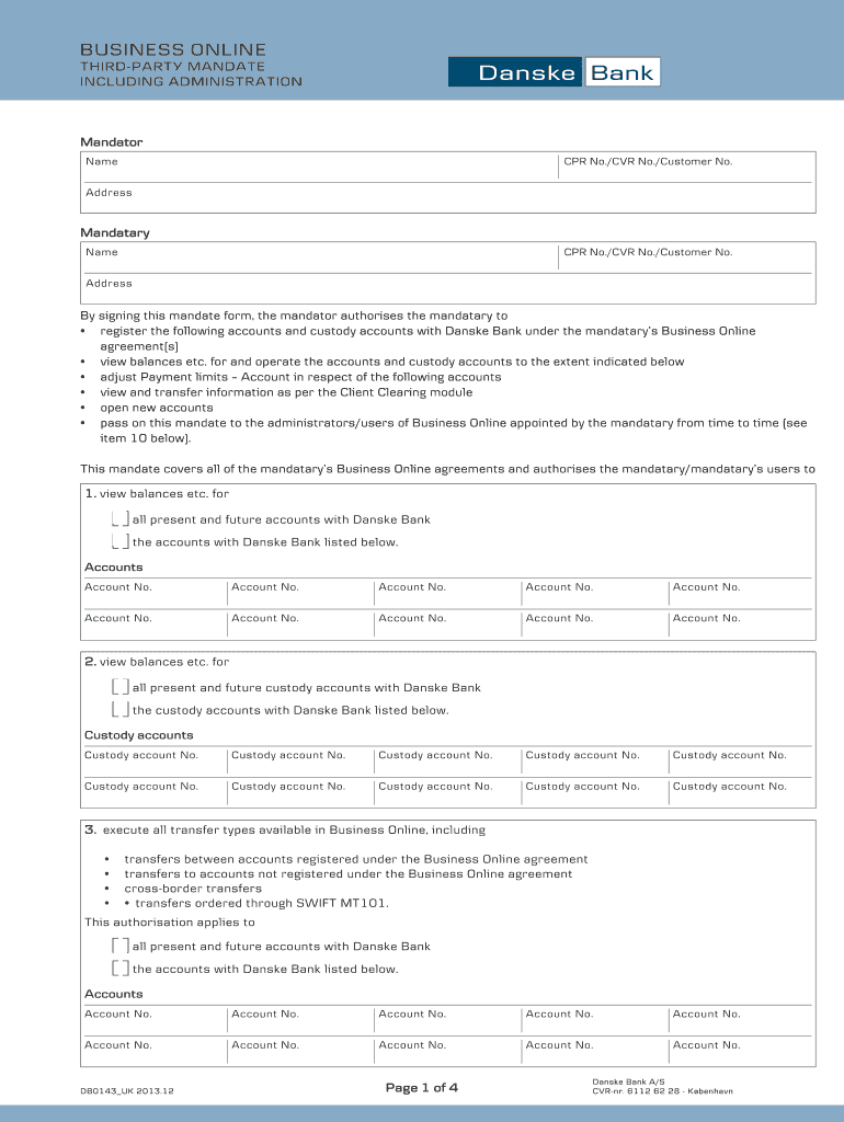BUSINESS O N L IN E TH I R D P A R T Y MANDATE E I N C L U D I N G ADMIN IST RAT ION Mandatory Name CPR No./CVR No./Customer No. Address Mandatory Name CPR No./CVR No./Customer No. Address By signing