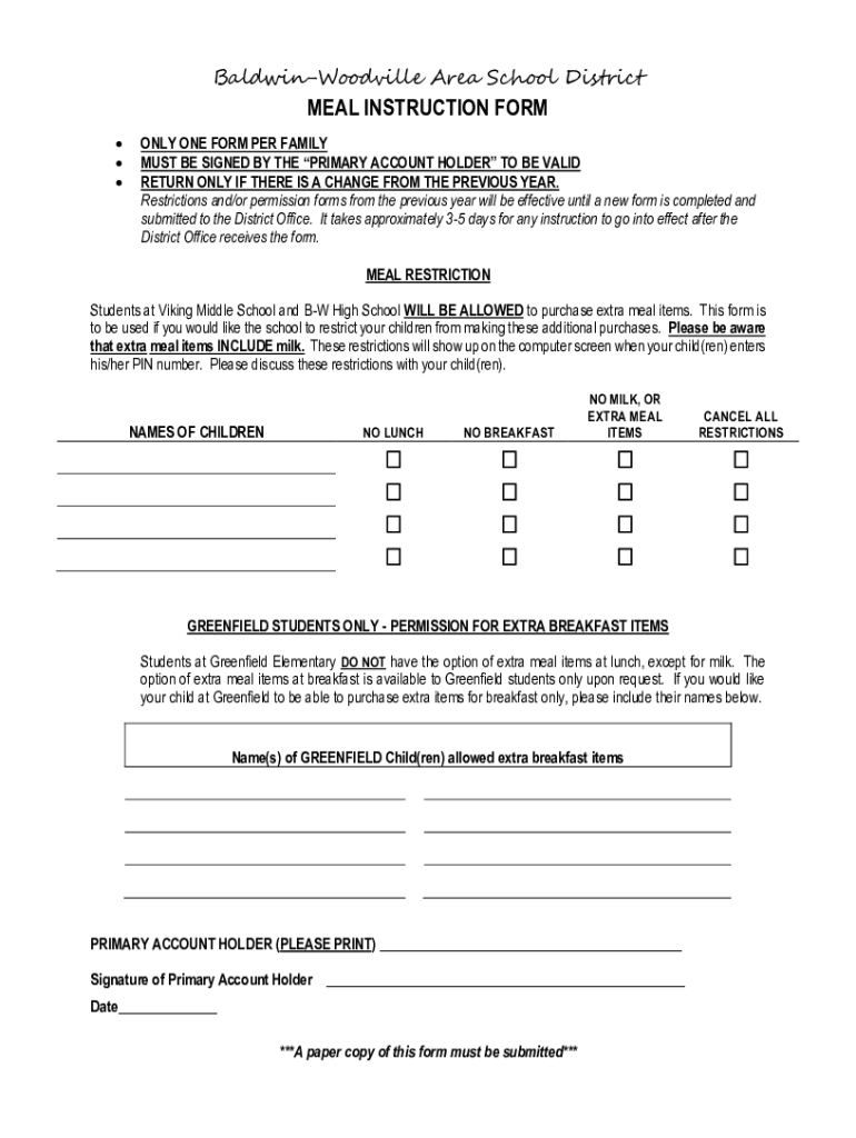 BaldwinWoodville Area School DistrictMEAL INSTRUCTION FORM ONLY ONE FORM PER FAMILY MUST BE SIGNED BY THE PRIMARY ACCOUNT HOLDER TO BE VALID RETURN ONLY IF THERE IS A CHANGE FROM THE PREVIOUS YEAR.