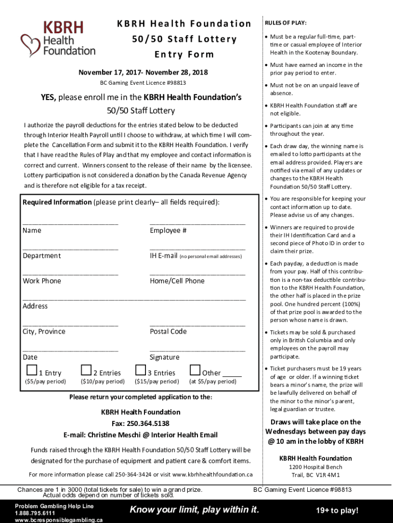 KBR Health Foundation 50/50 Staff Lottery Entry Formulas OF PLAY: Must be a regular full time, part-time or casual employee of Interior Health in the Kootenai Boundary. Must have earned an income