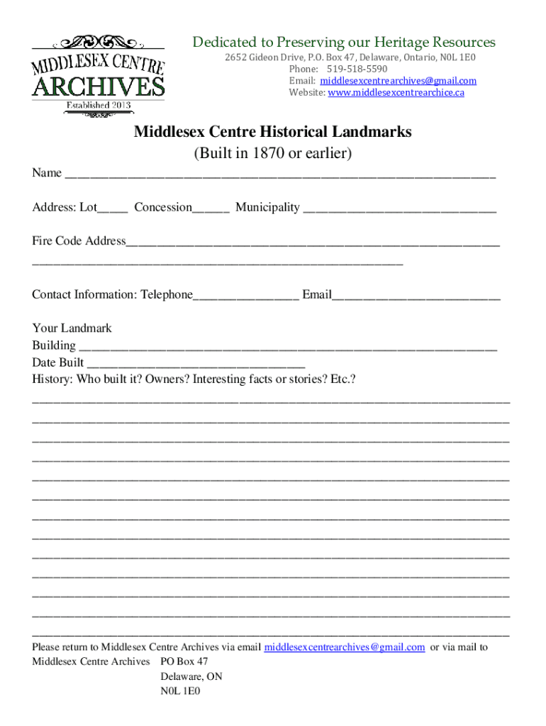 Dedicated to Preserving our Heritage Resources 2652 Gideon Drive, P.O. Box 47, Delaware, Ontario, N0L 1E0 Phone: 5195185590 Email: middlesexcentrearchives gmail.com Website: www.middlesexcentrearchice.caMiddlesex