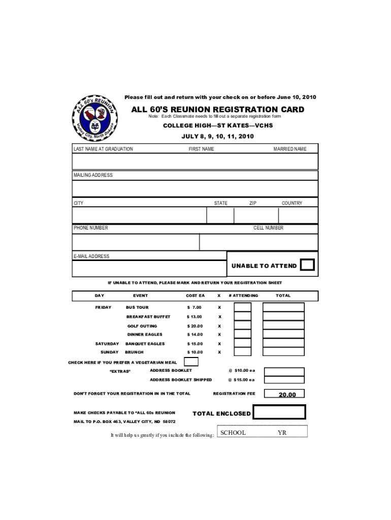Please fill out and return with your check on or before June 10, 2010ALL 60S REUNION REGISTRATION CARD