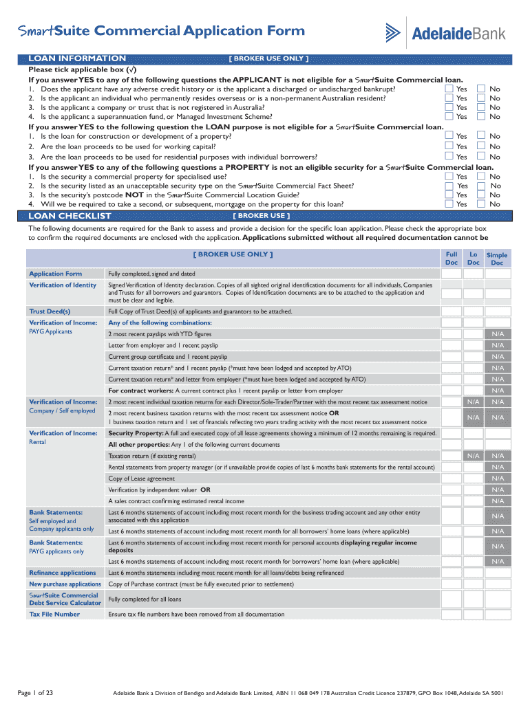 The SmartSuite Commercial Loan Application Form is a business document used by applicants and brokers to apply for commercial loans from Adelaide Bank in Australia.