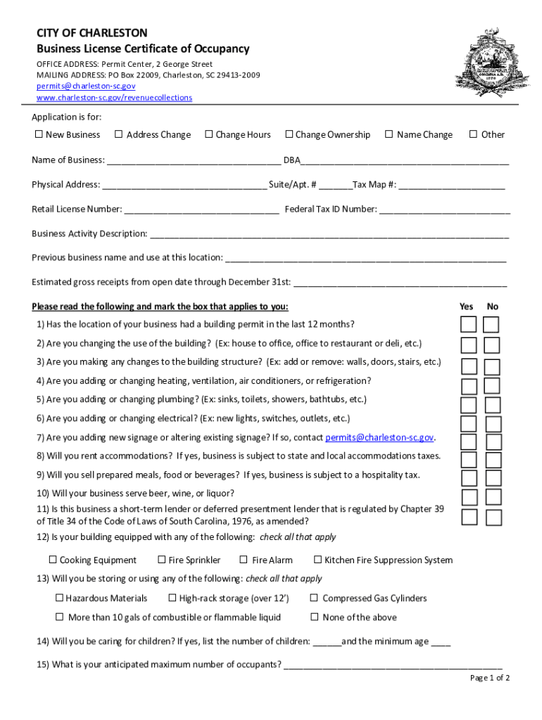 CITY OF CHARLESTON Business License Certificate of Occupancy OFFICE ADDRESS: Permit Center, 2 George Street MAILING ADDRESS: PO Box 22009, Charleston, SC 294132009 permits Charlestons.gov www.charlestonsc.gov/revenuecollectionsApplication