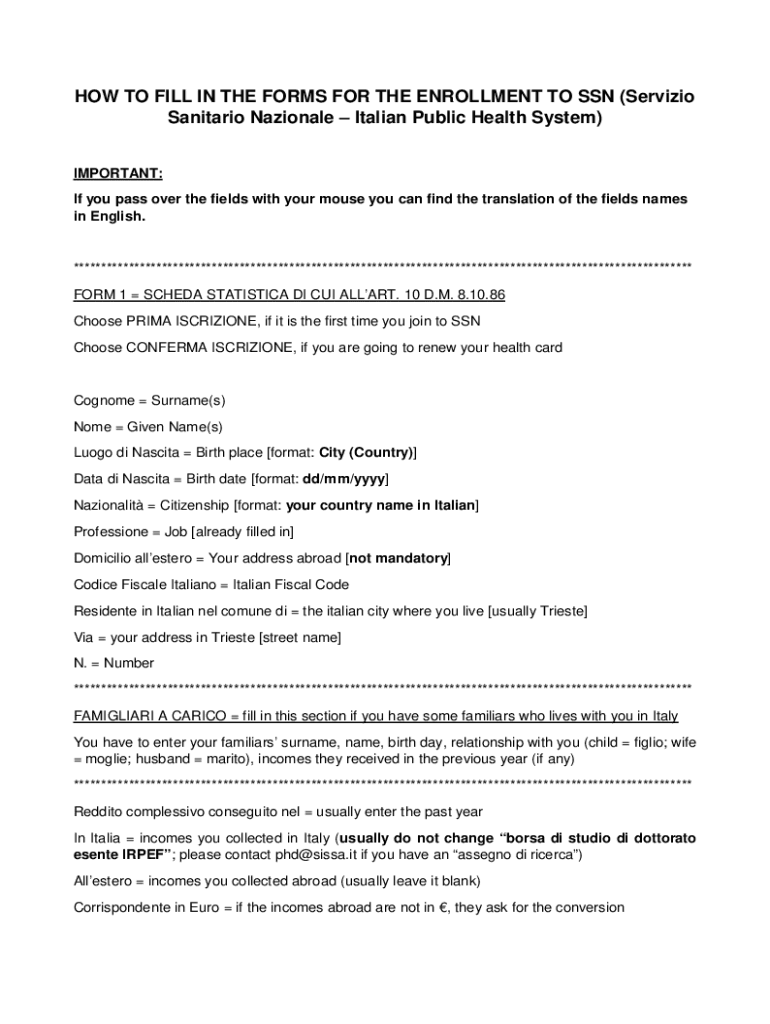 HOW TO FILL IN THE FORMS FOR THE ENROLLMENT TO SSN (Servillo Sanitation National Italian Public Health System) IMPORTANT: If you pass over the fields with your mouse you can find the translation of