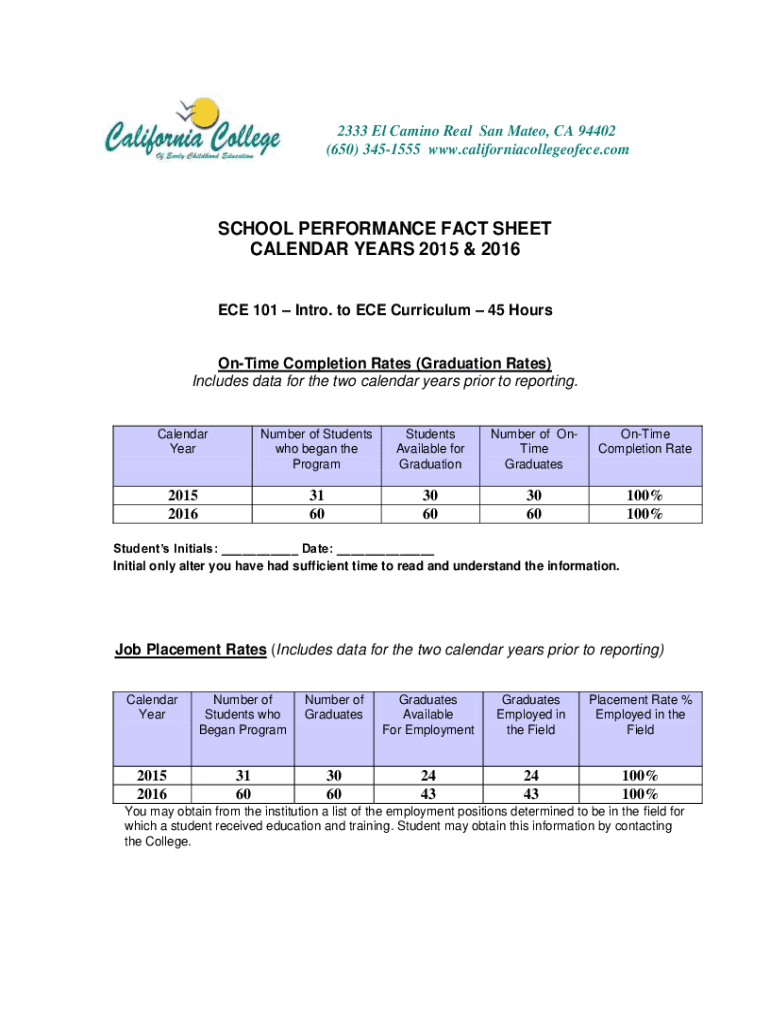 2333 El Camino Real San Mateo, CA 94402 (650) 3451555 www.californiacollegeofece.comSCHOOL PERFORMANCE FACT SHEET CALENDAR YEARS 2015 & 2016 ECE 101 Intro. To ECE Curriculum 45 HoursOnTime Completion