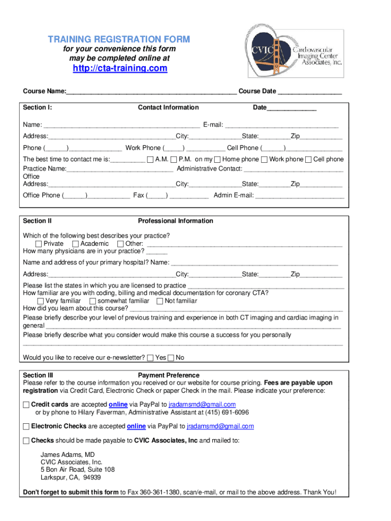 TRAINING REGISTRATION FORM for your convenience this form may be completed online athttp://ctatraining.com Course Name: Course Date Section I:Contact Informational Name: Email: Address: City: State: