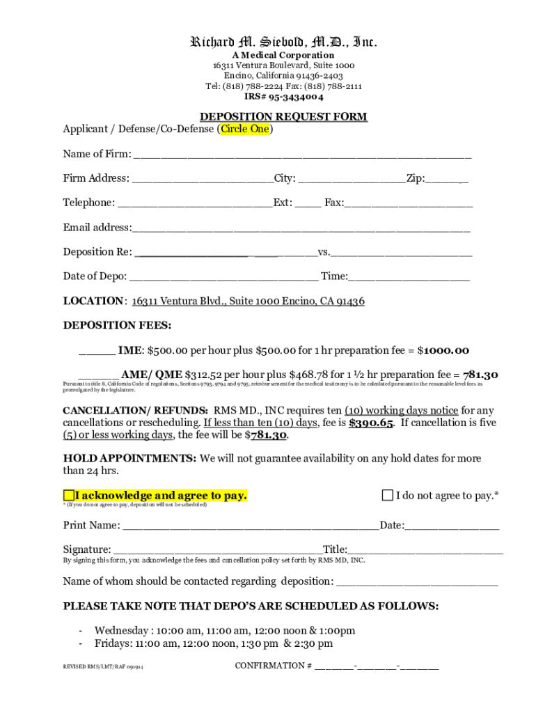Richard M. Piebald, M.D., Inc. A Medical Corporation 16311 Ventura Boulevard, Suite 1000 Engine, California 914362403 Tel: (818) 7882224 Fax: (818) 7882111 IRS# 953434004DEPOSITION REQUEST FORM Applicant
