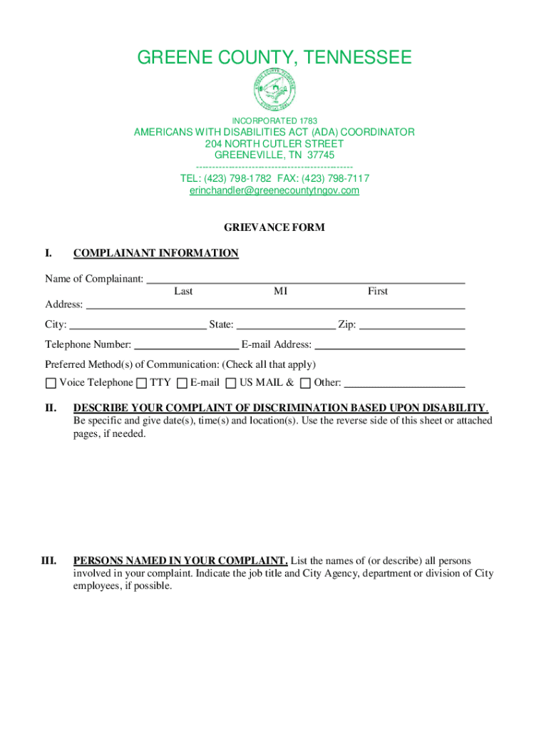GREENE COUNTY, TENNESSEEINCORPORATED 1783AMERICANS WITH DISABILITIES ACT (ADA) COORDINATOR 204 NORTH CUTLER STREET GREENVILLE, TN 37745 TEL: (423) 7981782 FAX: (423) 7987117 erinchandler greenecountytngov.