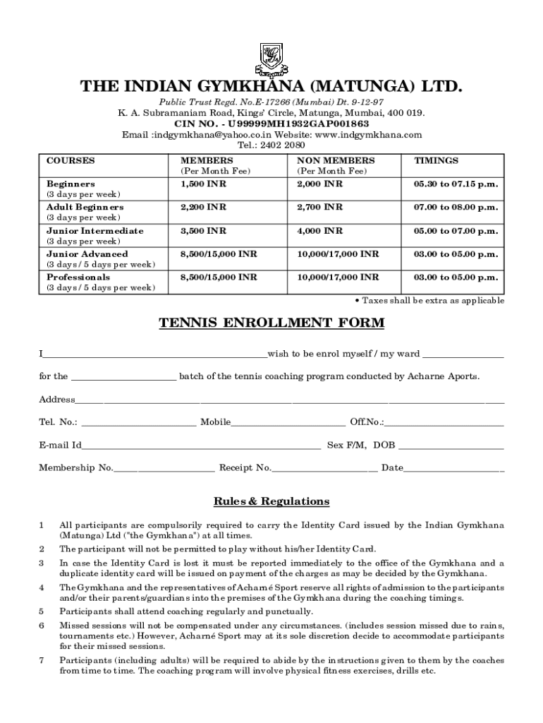 THE INDIAN GYMKHANA (MATING) LTD. Public Trust Red. No. E17266 (Mumbai) DT. 91297 K. A. Subramaniam Road, Kings Circle, Mating, Mumbai, 400 019. IN NO. U99999MH1932GAP001863 Email :ind gymkhana yahoo.co.in