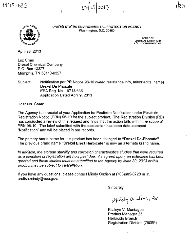 , 'UNITED STATES ENVIRONMENTAL PROTECTION AGENCY Washington, D.C. 20460rOFFICE OF CHEMICAL SAFETY AND POLLUTION PREVENTION April 23, 2013, Luz Chan Drexel Chemical Company P.O. Box13327 Memphis, TN