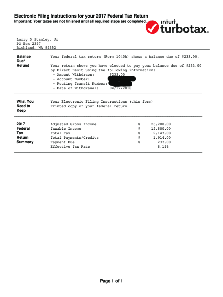 Electronic Filing Instructions for your 2017 Federal Tax Return Important: Your taxes are not finished until all required steps are completed. Larry D Stanley, Jr PO Box 2397 Richland, WA 99352 Your