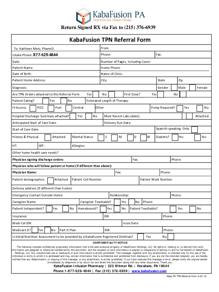 Return Signed RX via Fax to (215) 3766939KabaFusion TPN Referral Form