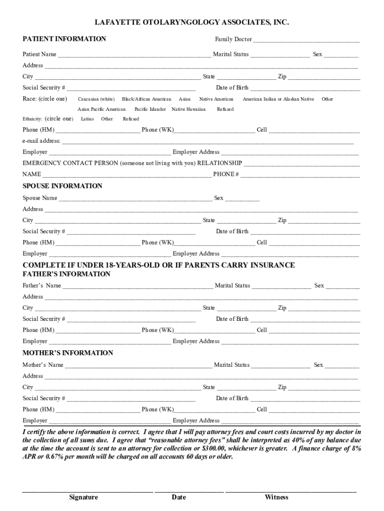 LAFAYETTE OTOLARYNGOLOGY ASSOCIATES, INC. PATIENT INFORMATIONFamily Doctor Patient Name Marital Status Sex Address City State Zip Social Security # Race: (circle one)Caucasian (white)Black/African