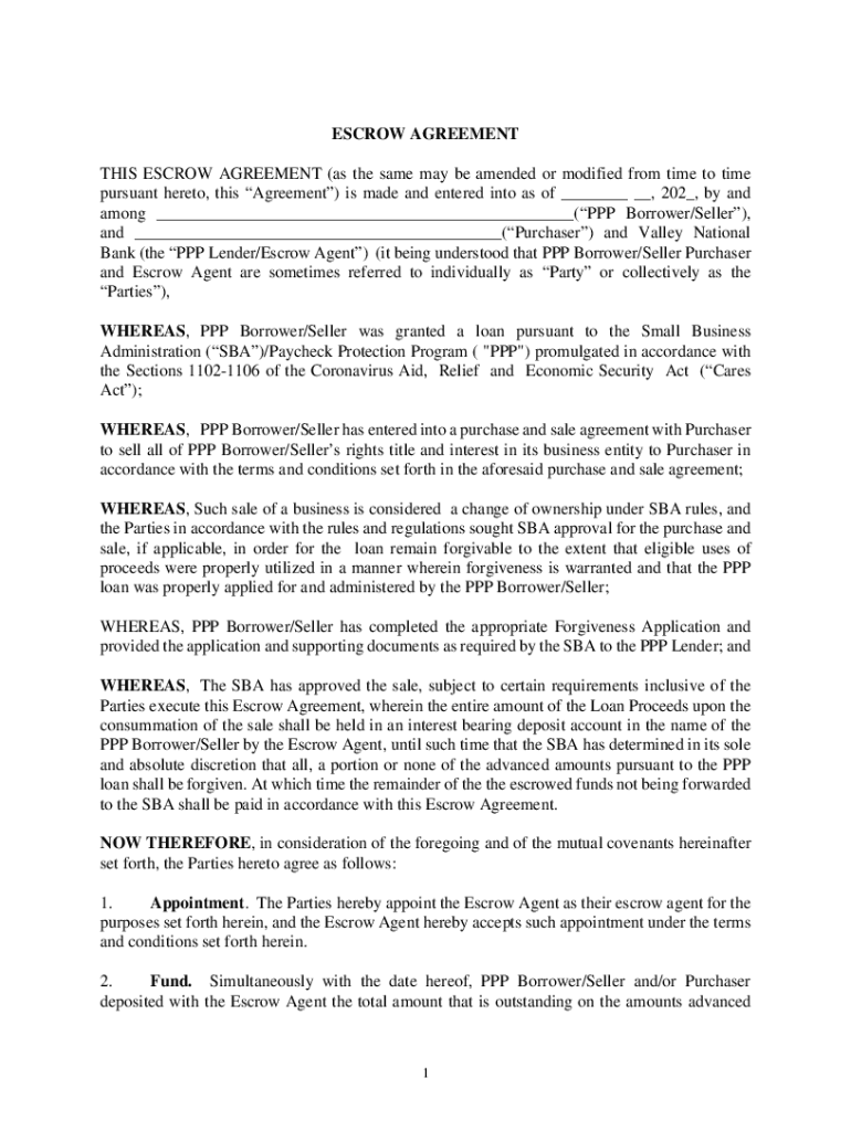 ESCROW AGREEMENT THIS ESCROW AGREEMENT (as the same may be amended or modified from time to time pursuant hereto, this Agreement) is made and entered into as of, 202, by and among (PPP Borrower/Seller),
