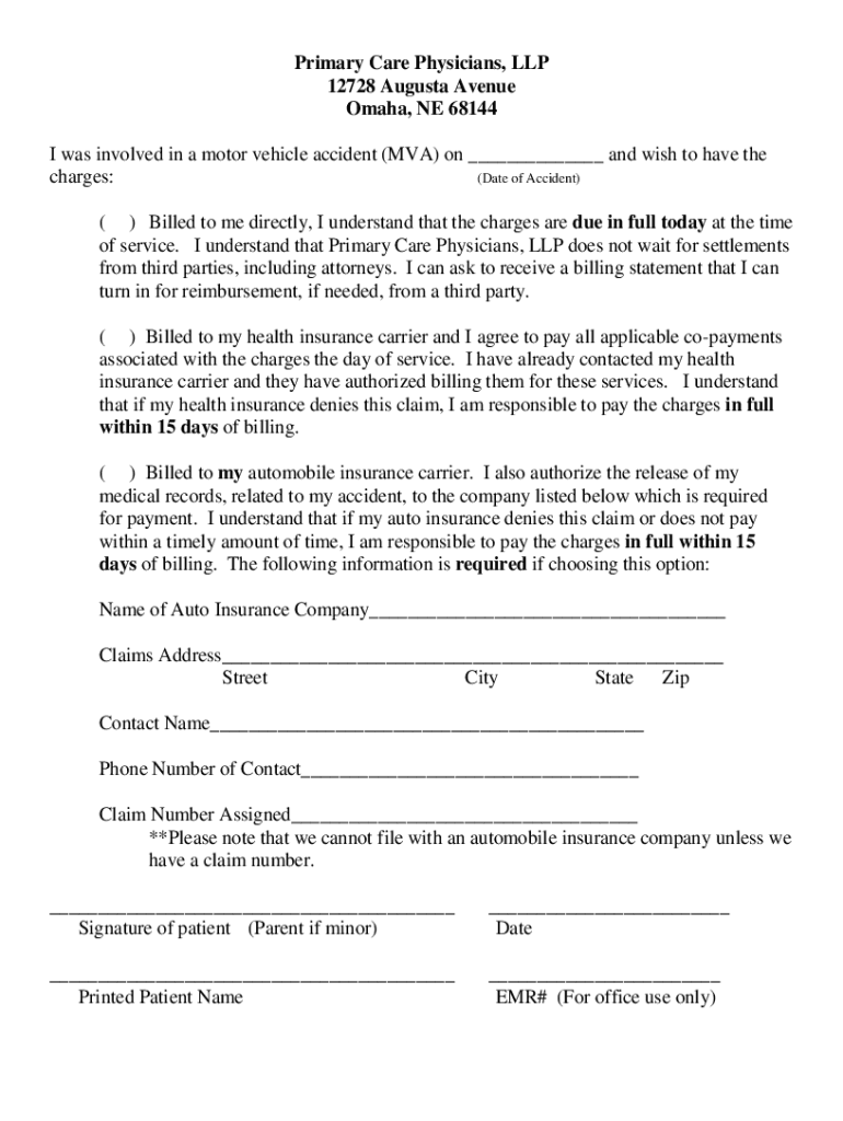 Primary Care Physicians, LLP 12728 Augusta Avenue Omaha, NE 68144 I was involved in a motor vehicle accident (MVA) on and wish to have the charges: (Date of Accident) () Billed to me directly, I understand