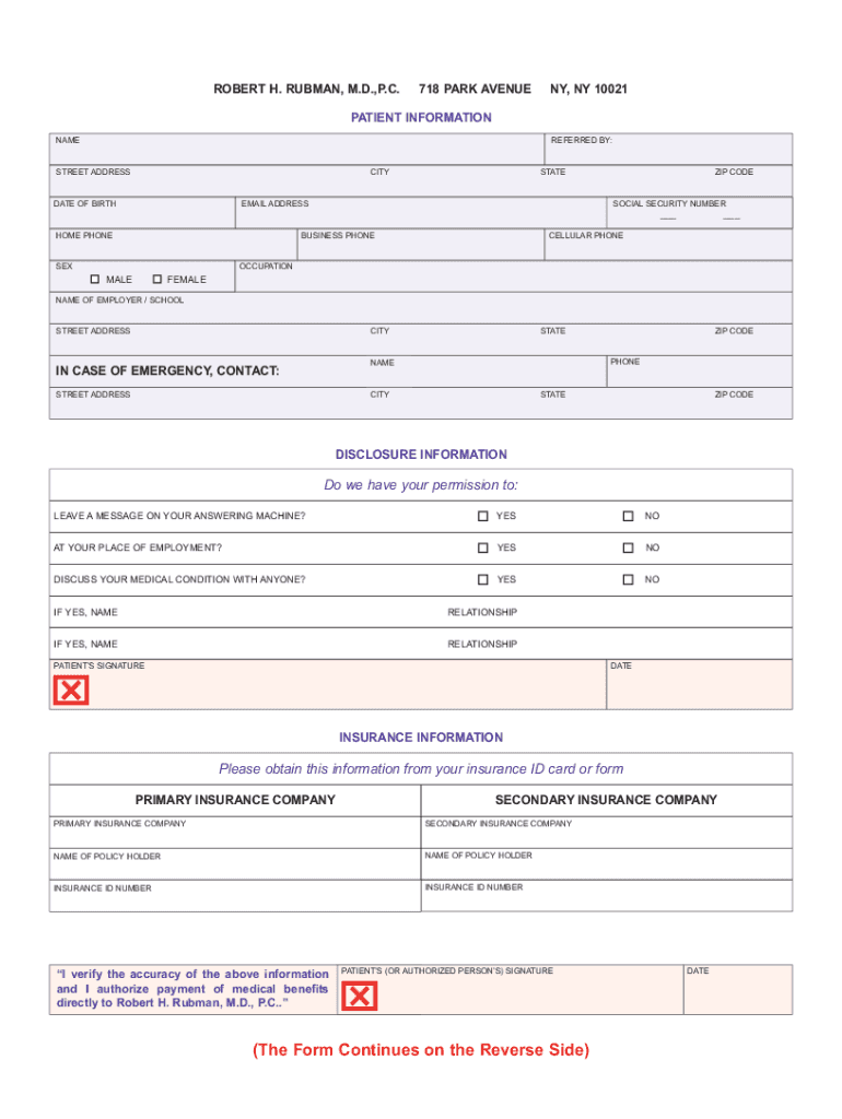 ROBERT H. TUBMAN, M.D., P.C.718 PARK AVENUE NY, NY 10021PATIENT INFORMATION NAMEREFERRED BY:STREET ADDRESSCITYDATE OF BIRTHSTATEEMAIL ADDRESSABLE PHONETICIAN SECURITY NUMBER BUSINESS PHONESEXZIP CODE