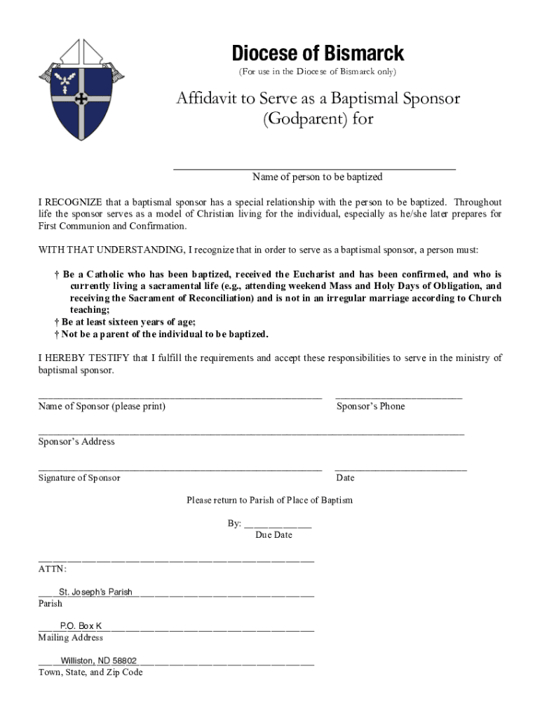 Diocese of Bismarck (For use in the Diocese of Bismarck only)Affidavit to Serve as a Baptismal Sponsor (Godparent) for Name of person to be baptized I RECOGNIZE that a baptismal sponsor has a special