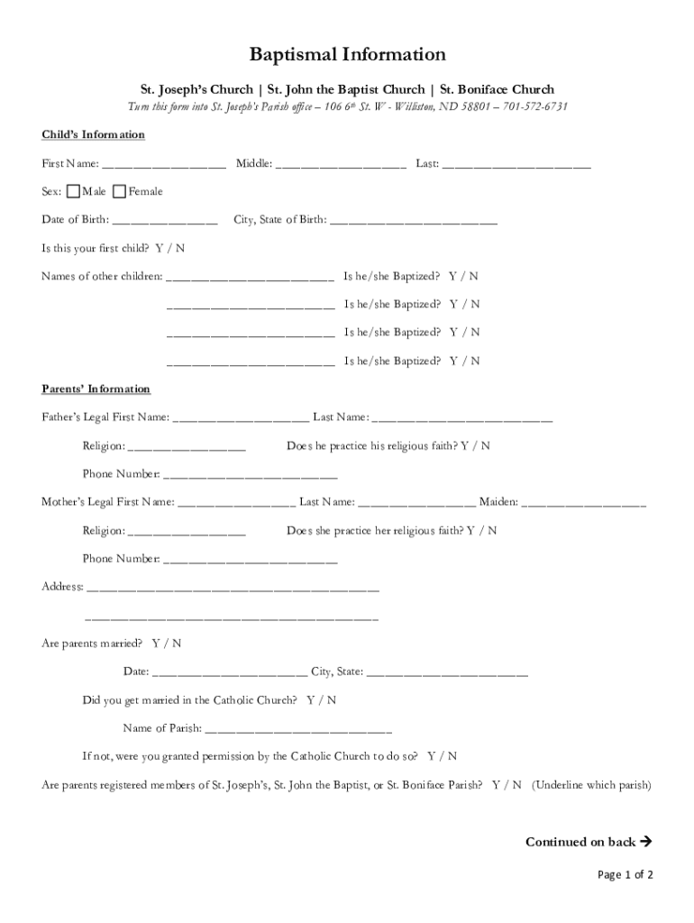 Baptismal Information St. Josephs Church St. John the Baptist Church St. Boniface Church Turn this form into St. Josephs Parish office 106 6th St. W Williston, ND 58801 7015726731 Child's Information