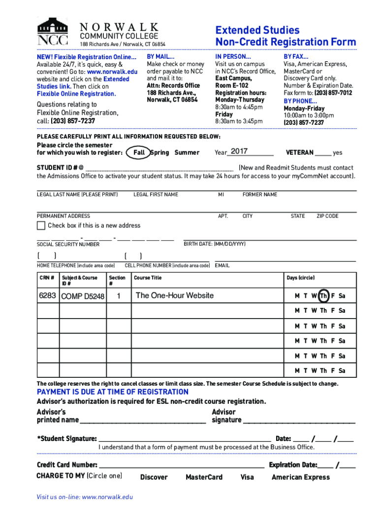 N O RWA L Extended Studies Noncredit Registration FormCOMMUNITY COLLEGE 188 Richards Ave / Norwalk, CT 06854NEW! Flexible Registration Online Available 24/7, its quick, easy & convenient! Go to: www.norwalk.edu