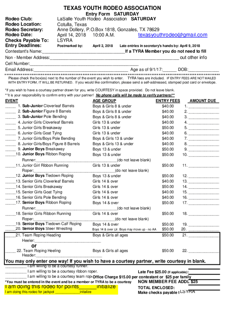 TEXAS YOUTH RODEO ASSOCIATION Rodeo Club: Rodeo Location: Rodeo Secretary: Rodeo Date: Checks Payable To: Entry Deadlines:Entry Form SATURDAY Basally Youth Rodeo Association SATURDAY Corolla, Texas